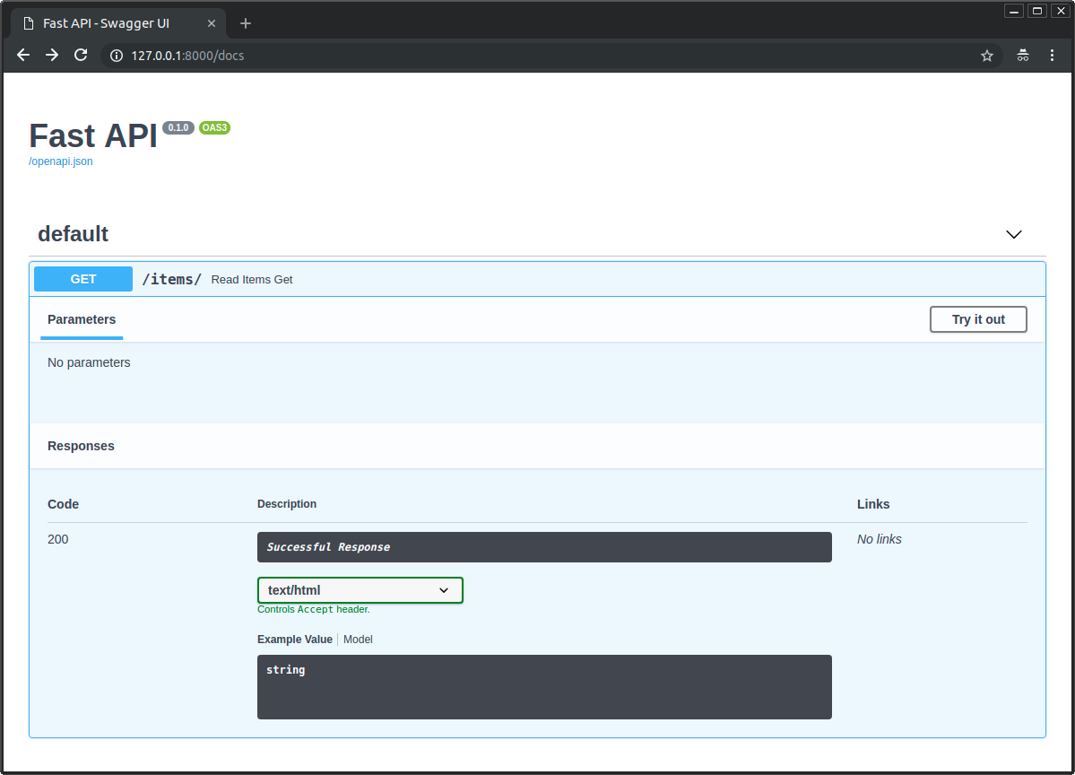但由于你也将 HTMLResponse 传递给了 response_class,FastAPI 将知道如何在 OpenAPI 和交互式文档中将其记录为带有 text/html 的 HTML: