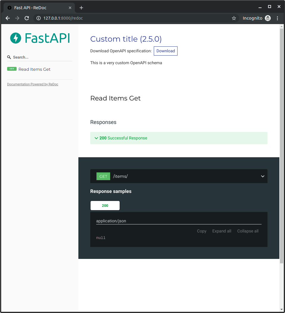 一旦您访问 http://127.0.0.1:8000/redoc,您将看到您正在使用自定义徽标(在此示例中为 FastAPI 的徽标):