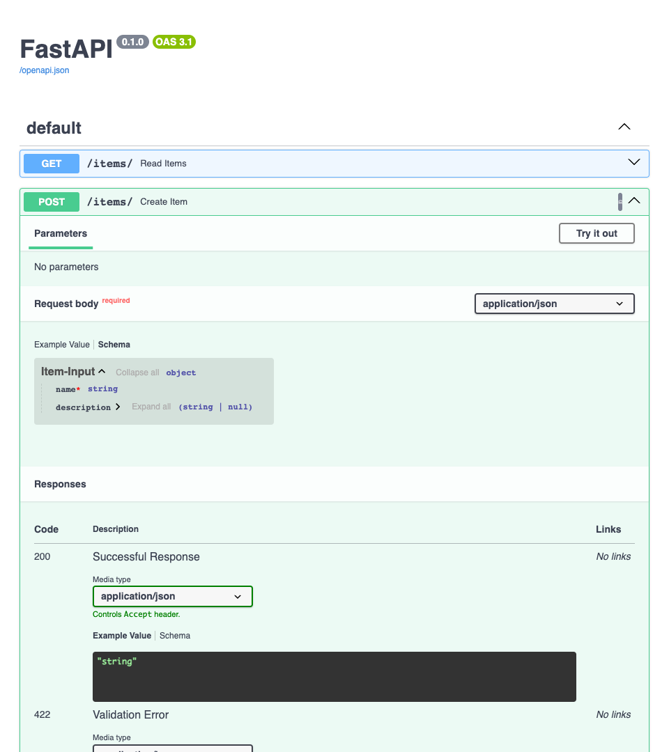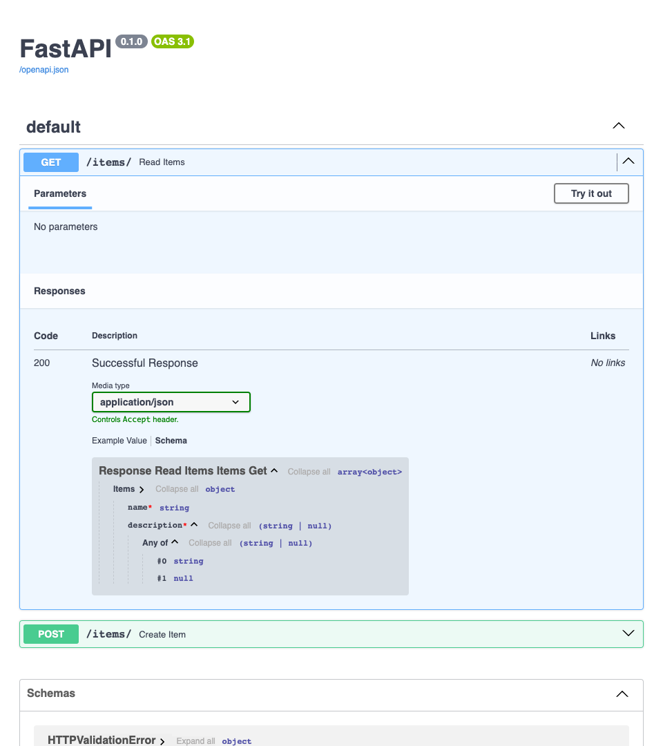现在,模型的输入和输出将有一个单一的模式,只有 Item,并且 description 将不是必需的: