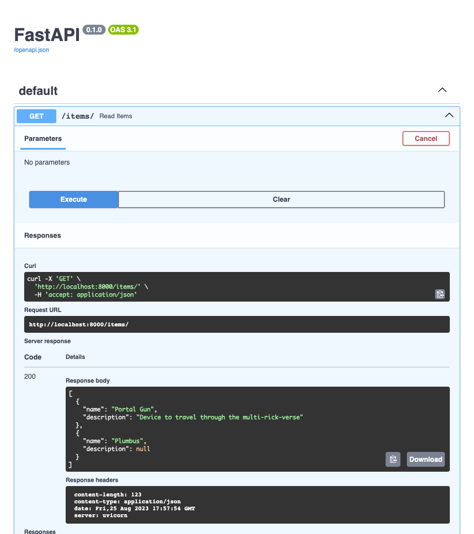如果你检查 OpenAPI 中所有可用的模式(JSON 模式),你会看到有两个,一个是 Item-Input,一个是 Item-Output。