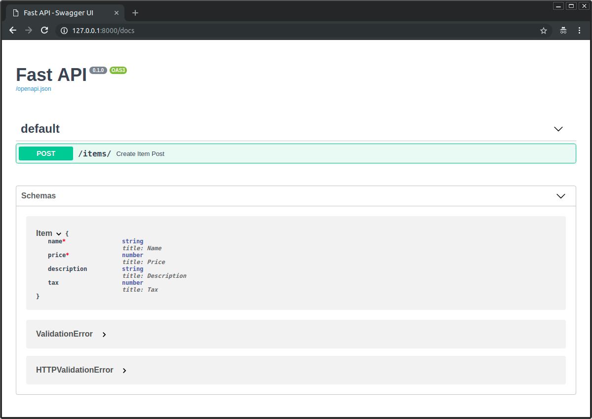 你的模型的 JSON 模式将成为生成的 OpenAPI 模式的一部分,并显示在交互式 API 文档中: