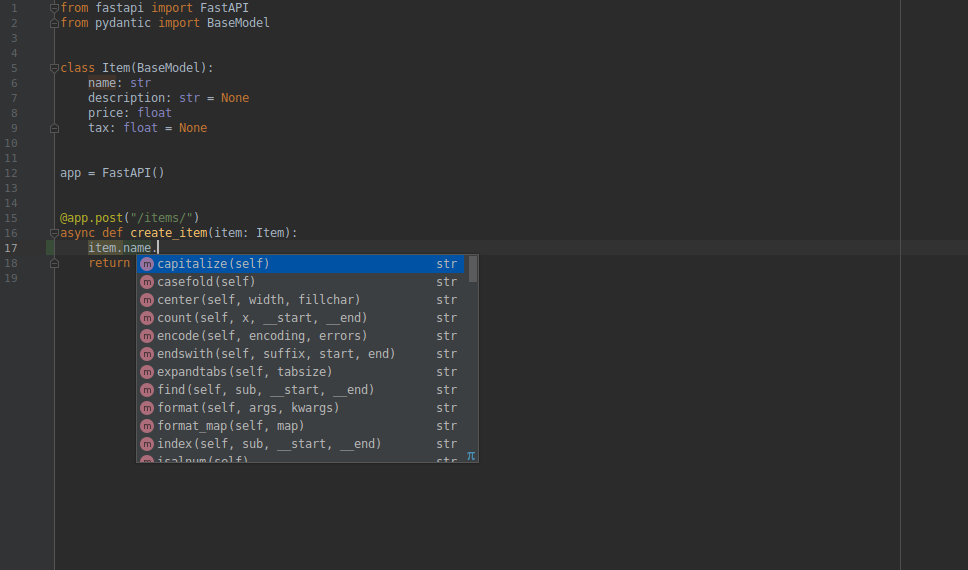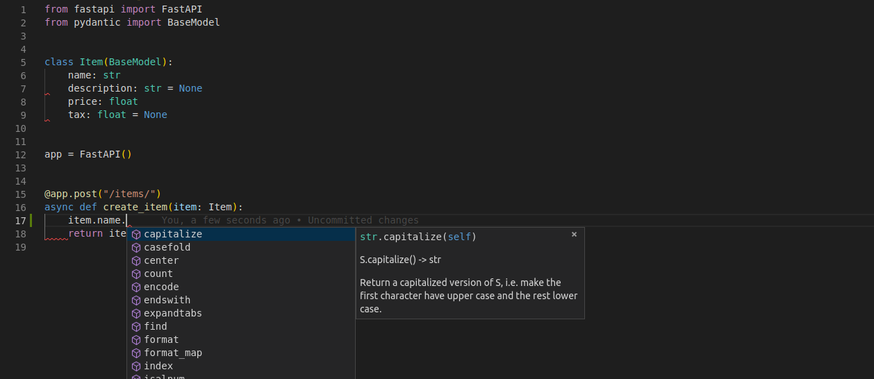 在你的编辑器中,在函数内部你将在各处获得类型提示和自动完成(如果你接收的是 dict 而不是 Pydantic 模型,则不会发生这种情况):